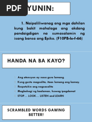 1Epiko 2Alamat 3Kwentong bayan. Ang pasalindilang pagbabahagi ng epiko ay inaawit ng isang pinuno ng tribu o isang Babaylan. Ang Panitikan sa Isang Klaseng Pangwika Para sa mabisang pagkatuto ng wika kailangang handugan ang mag-aaral ng kasiya-siyang bilang ng awtentikong kagamitan sa pagkatuto na abot ng kanilang pang-unawa-mga kagamitan sa pagkatuto na tinagurian ni krashen 1982 na.
