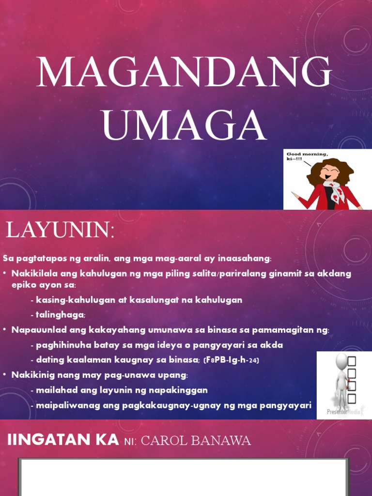 NILAY-KARUNUNGAN Ang taong may malinis na kalooban ay walang kinakatakutan. Ang ilan sa mga katangian ng epiko ay ang paggamit ng mga bansag sa pagkilala sa tiyak na tao may mga inuulit na salita o parirala mala-talata na paghahati o dibisyon sa mga serye ng kanta at kadalasan ay umiikot sa bayani kasama na ang kanyang mga sagupaan sa mga mahihiwagang nilalang anting-anting at sa paghahanap sa kanyang minamahal o magulang. Ayon sa kanilang paniniwala upang tumagal ang buhay ng tao itoy pinaalagaan at iniingatan ng isang isda hayop halaman o ng punongkahoy.