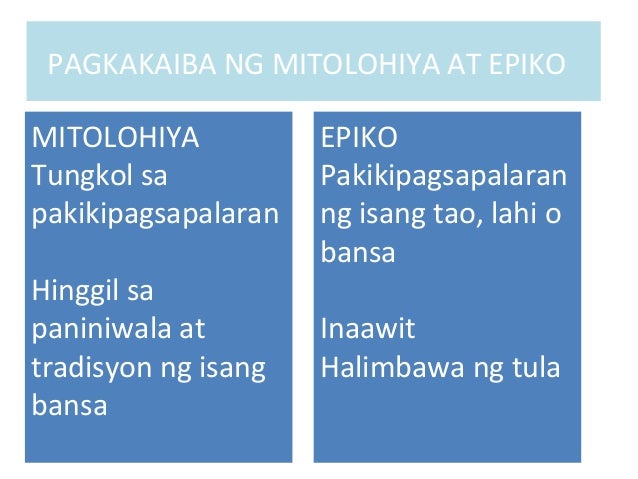 Pero ang isang tula ay maaaring mag bigay ng ideya na galing rin sa isang epiko. PAGKAKAIBA NG MITOLOHIYA AT EPIKO MITOLOHIYA Isang halimbawa ng tuluyan maikling kuwento sa partikular Ritwal paniniwala sayaw at iba pa EPIKO Ginaganap sa pamamagitan ng sayaw-dula na may kasaliw na musika 10. Marami sa mga kuwento ng pag-iibigan ay umabot sa haba ng isang epiko subalit hindi mauuring epiko.