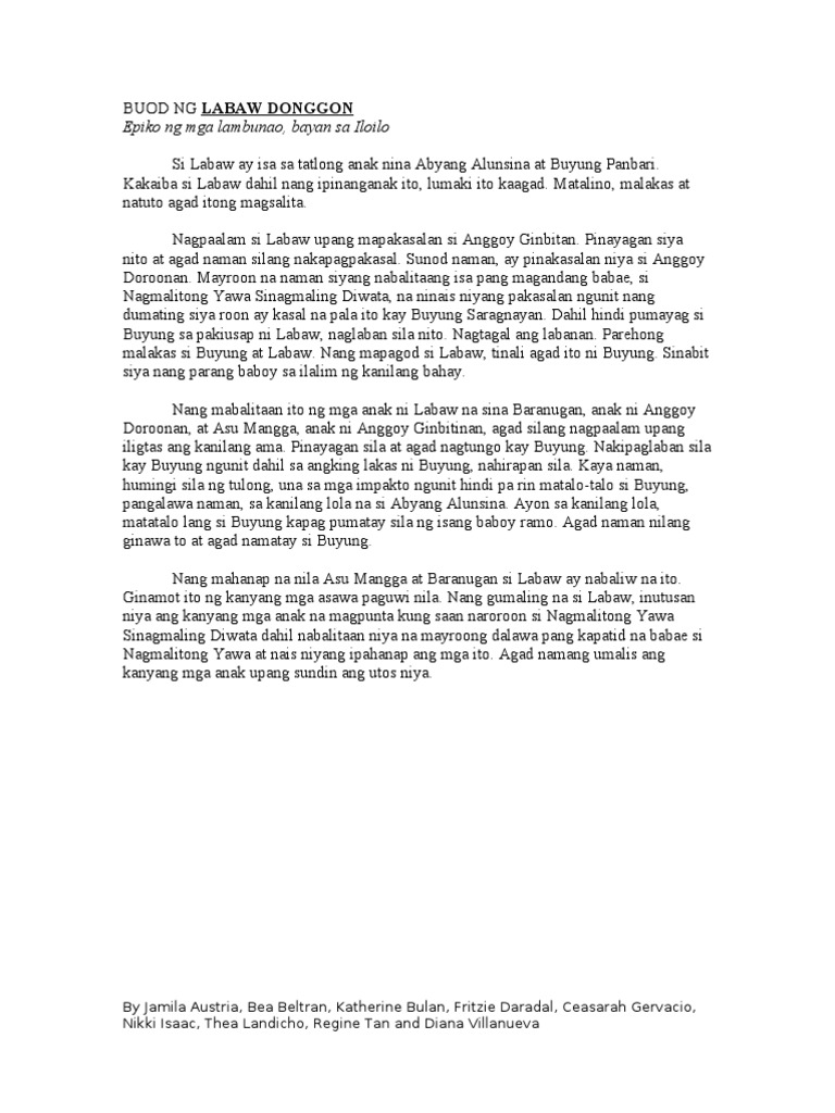 Bilang epiko kinikilala itong isang uri ng panitikan na tumatalakay sa mga kabayanihan at pakikipagunggali ng isang tao laban sa mga kaaway na halos hindi kapani-paniwala Bilang epiko inaasahan ang Labaw Donggon na maging kwento ng kabayanihan na punong puno ng mga nakamamangha at nakagugulat na mga pangyayari. Balangkas Ng Maikling Kwento 1. Kailangang isaalang-alang ang ukol sa kaasalan.