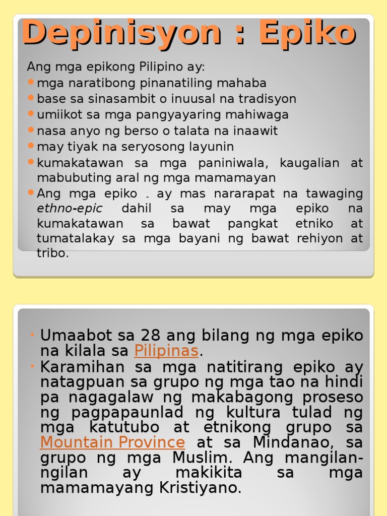 Lahat ng mga epikong nabanggit ay mga kwento ng kabayanihan at nagsasalaysay ng mga lakbay ng mga bida ng kwento. Talumpati ni Noli De Castro sa Pagdiriwang. Sa Plipinas may ibat ibang uri ng wika na ginagamit ito ay ang mga sumusunod.